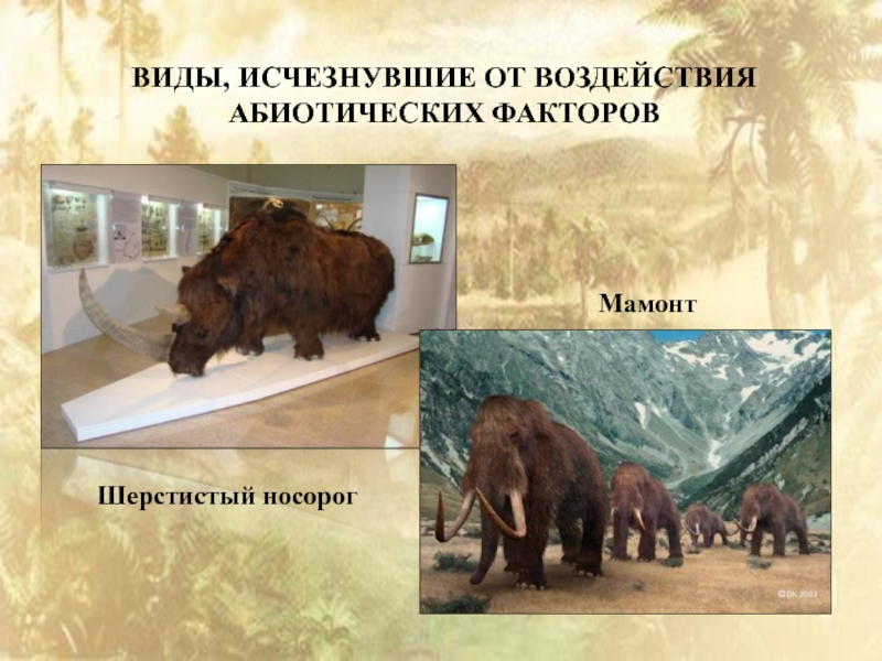 ВИДЫ, ИСЧЕЗНУВШИЕ ОТ ВОЗДЕЙСТВИЯ АБИОТИЧЕСКИХ ФАКТОРОВШерстистый носорогМамонт