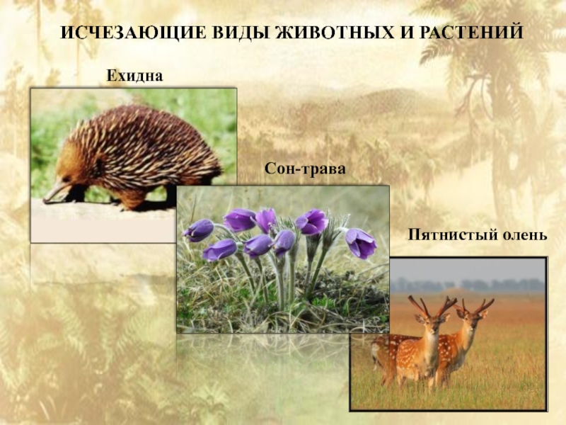 ИСЧЕЗАЮЩИЕ ВИДЫ ЖИВОТНЫХ И РАСТЕНИЙЕхиднаСон-траваПятнистый олень