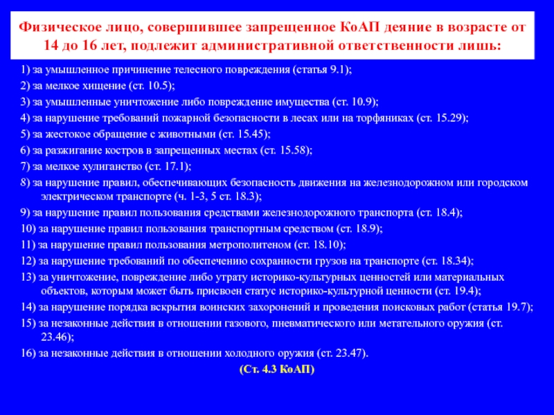 Слайд 17Физическое лицо, совершившее запрещенное КоАП деяние в возрасте от 14