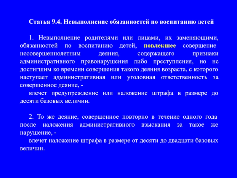 Слайд 14Статья 9.4. Невыполнение обязанностей по воспитанию детей