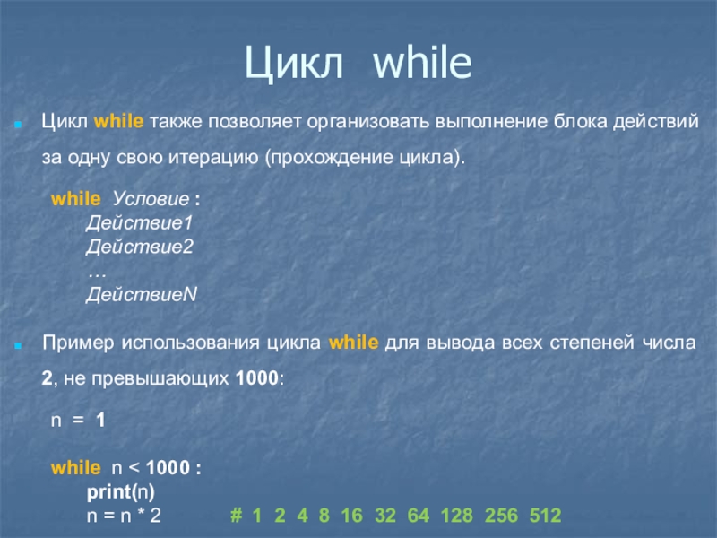 Цикл while также позволяет организовать выполнение блока действий за
