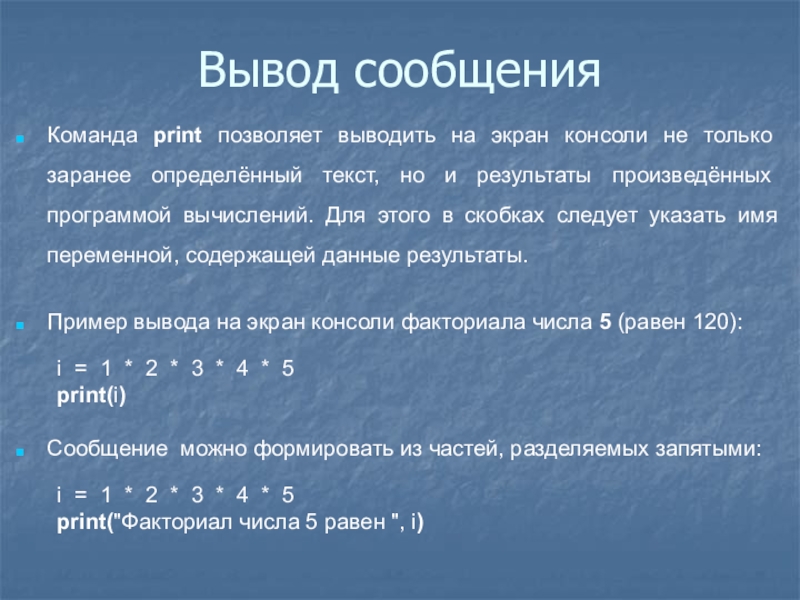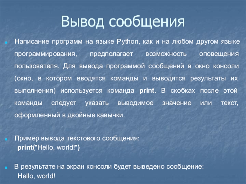 сообщений в окно консоли (окно, в котором вводятся команды и выводятся результаты их выполнения) используется команда print. В скобках после этой команды следует указать выводимое значение или текст, оформленный в двойные кавычки.