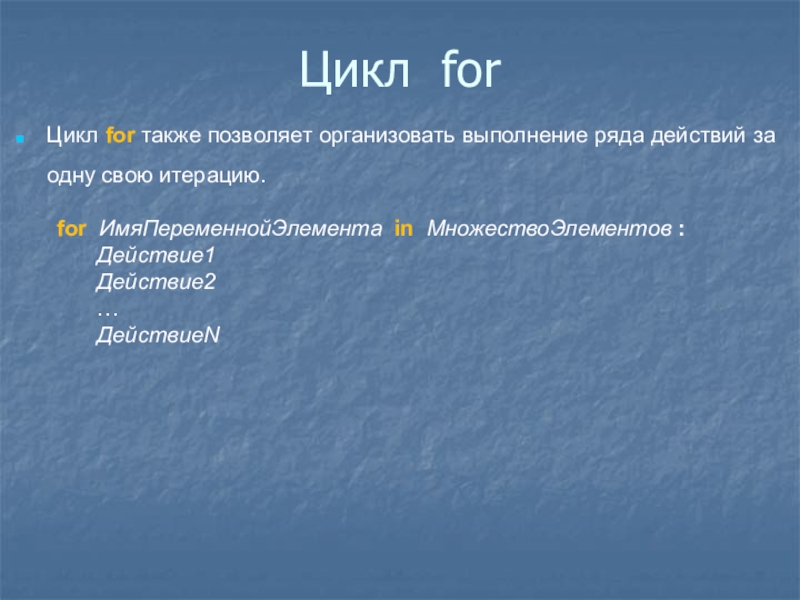 Цикл for также позволяет организовать выполнение ряда действий за