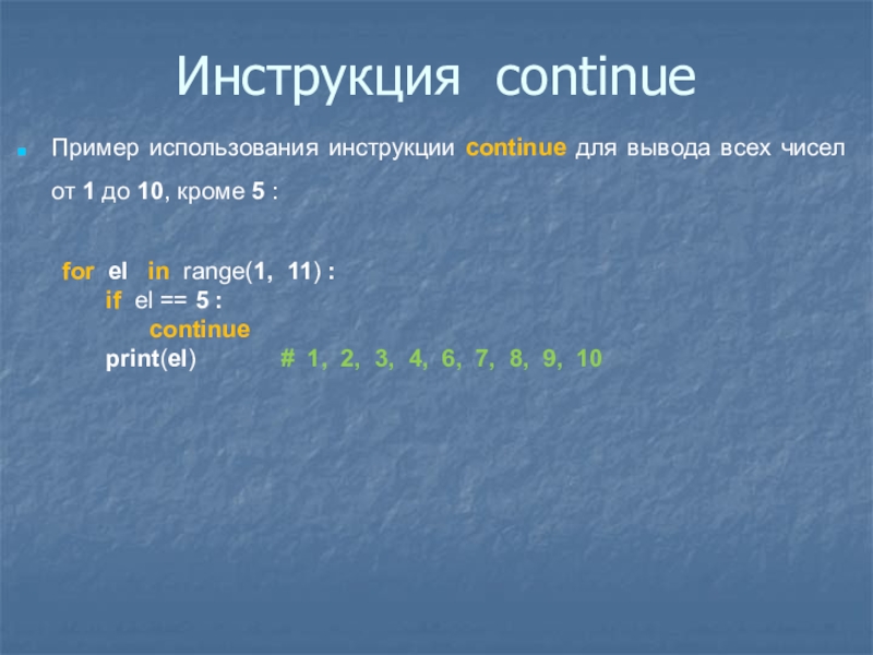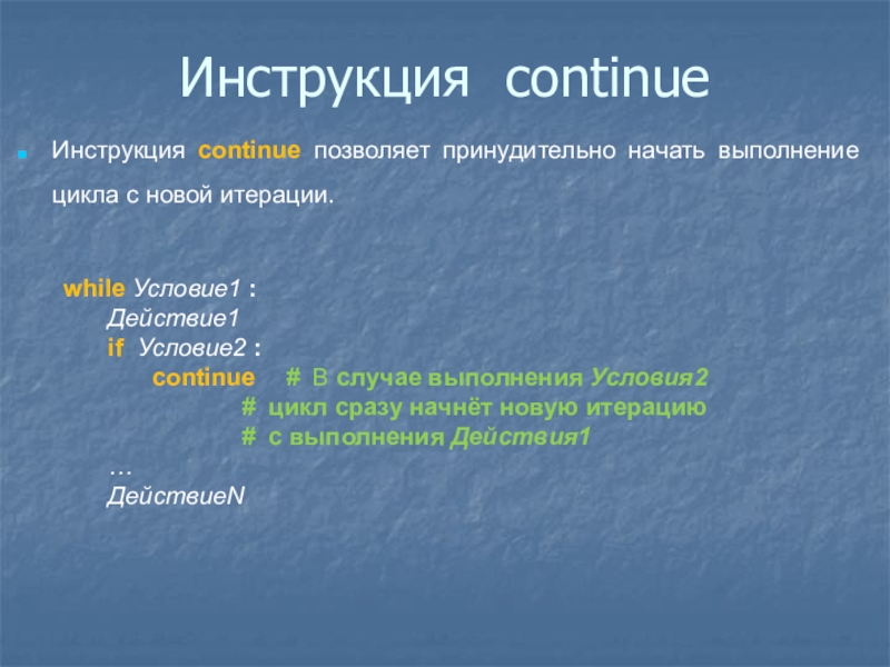 Слайд 28Инструкция continue