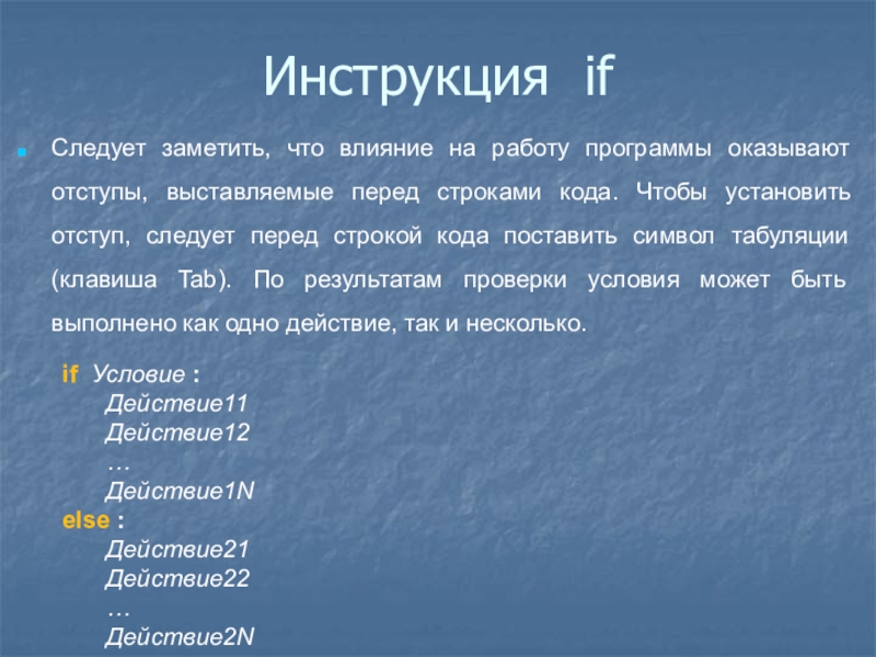 кода поставить символ табуляции (клавиша Tab). По результатам проверки условия может быть выполнено как одно действие, так и несколько.