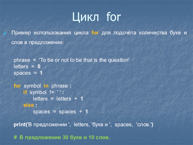 Пример использования цикла for для подсчёта количества букв и