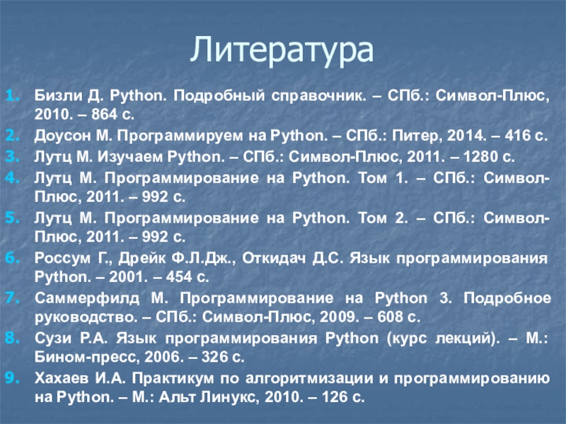 Бизли Д. Python. Подробный справочник. – СПб.: Символ-Плюс, 2010. –