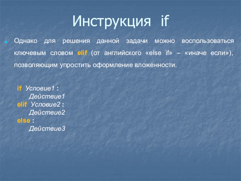 elif (от английского «else if» – «иначе если»), позволяющим упростить