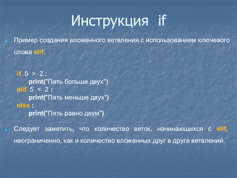 Следует заметить, что количество веток, начинающихся с elif, неограниченно, как и количество вложенных друг в друга ветвлений.