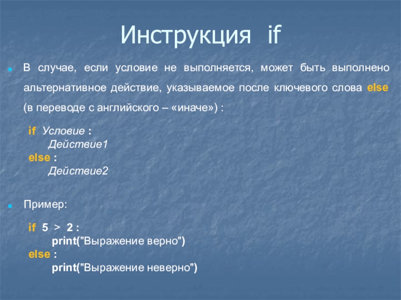 В случае, если условие не выполняется, может быть выполнено альтернативное действие.