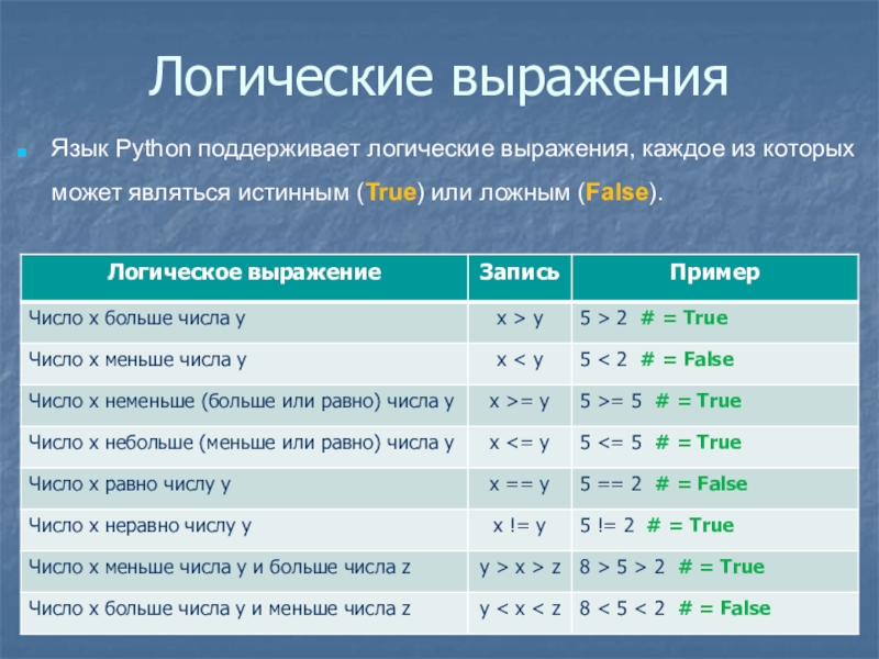 Язык Python поддерживает логические выражения, каждое из которых может