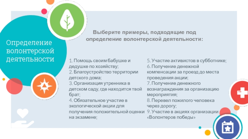 Выберите примеры, подходящие под определение волонтерской деятельности: