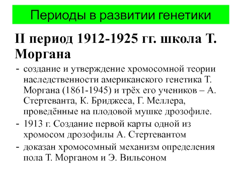 трёх его учеников – А. Стертеванта, К. Бриджеса, Г. Меллера, проведённые на плодовой мушке дрозофиле.