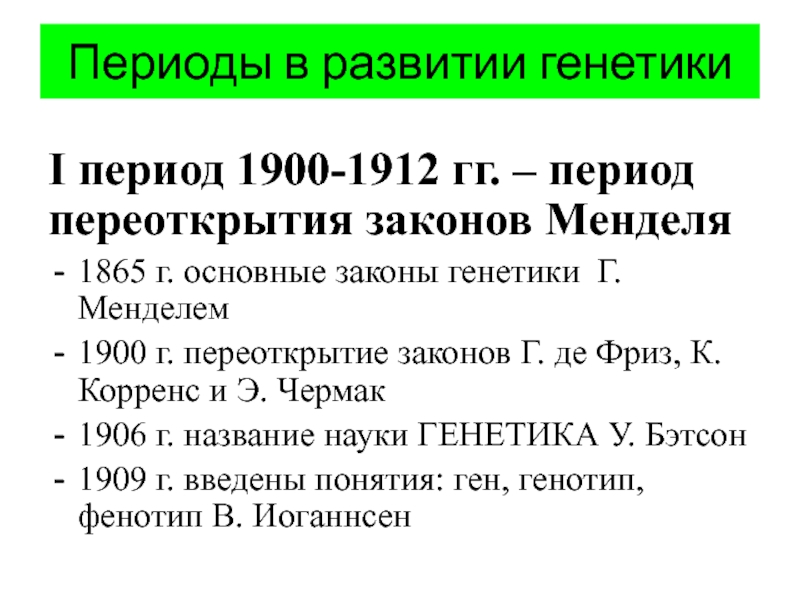 1909 г. введены понятия: ген, генотип, фенотип В. Иоганнсен