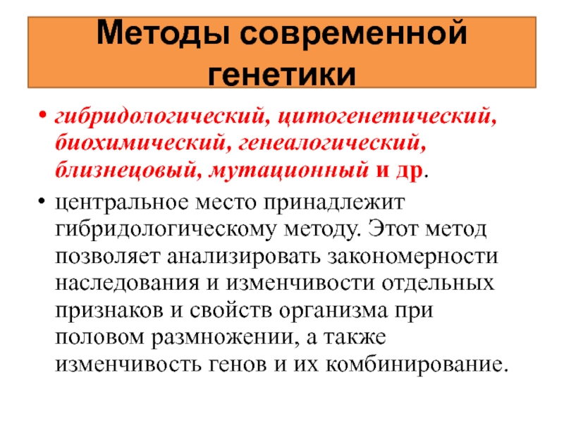 гибридологический, цитогенетический, биохимический, генеалогический, близнецовый, мутационный и др.