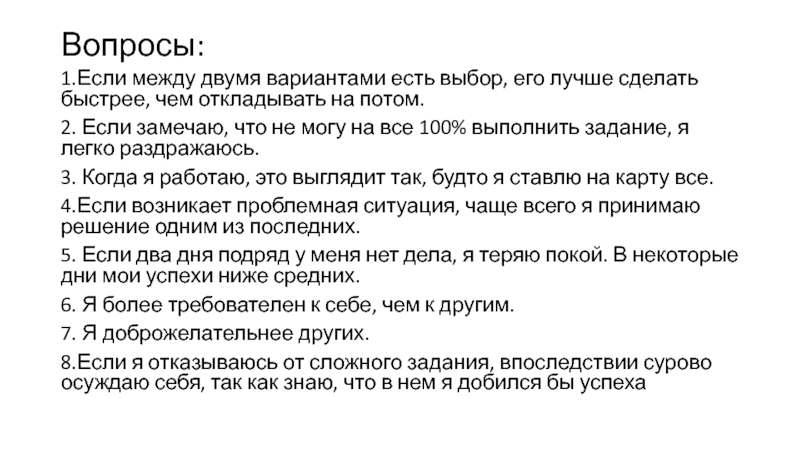 8.Если я отказываюсь от сложного задания, впоследствии сурово осуждаю себя, так как знаю, что в нем я добился бы успеха