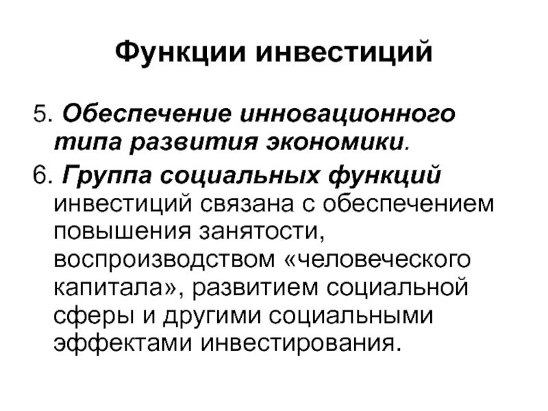 функций инвестиций связана с обеспечением повышения занятости, воспроизводством «человеческого капитала»,