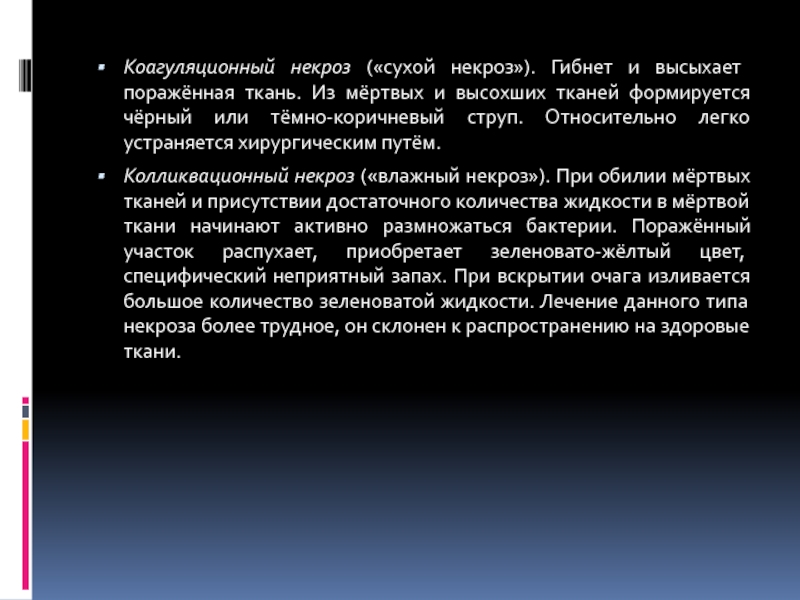 Слайд 16Коагуляционный некроз («сухой некроз»). Гибнет и высыхает поражённая ткань. Из