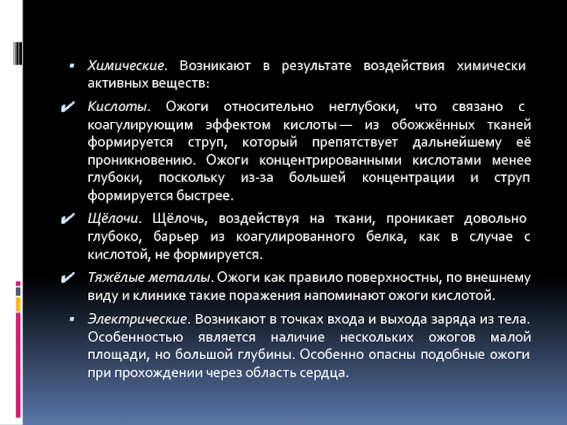 формируется струп, который препятствует дальнейшему её проникновению. Ожоги концентрированными кислотами менее глубоки, поскольку из-за большей концентрации и струп формируется быстрее.