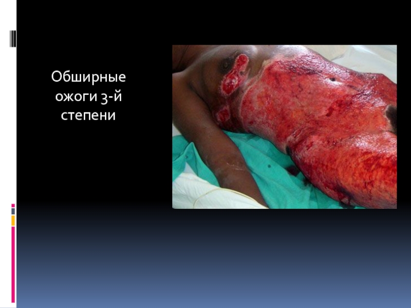 Слайд 9Ожоги 3б и 4-й степени, видны очаги некроза