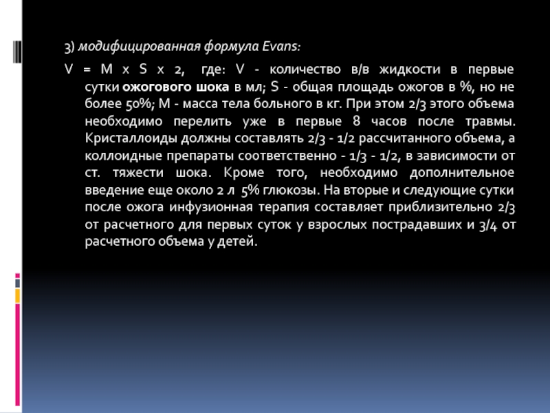 шока в мл; S - общая площадь ожогов в %, но не более 50%; M - масса тела больного в кг. При этом 2/3 этого объема необходимо перелить уже в первые 8 часов после травмы. Кристаллоиды должны составлять 2/3 - 1/2 рассчитанного объема, а коллоидные препараты соответственно - 1/3 - 1/2, в зависимости от ст. тяжести шока. Кроме того, необходимо дополнительное введение еще около 2 л 5% глюкозы. На вторые и следующие сутки после ожога инфузионная терапия составляет приблизительно 2/3 от расчетного для первых суток у взрослых пострадавших и 3/4 от расчетного объема у детей.