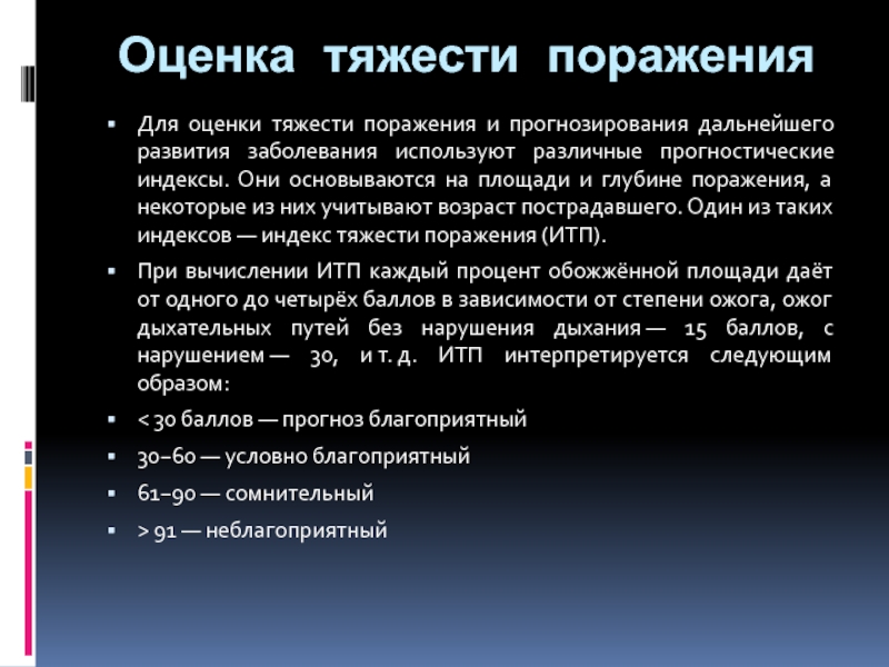 глубине поражения, а некоторые из них учитывают возраст пострадавшего. Один из таких индексов — индекс тяжести поражения (ИТП).