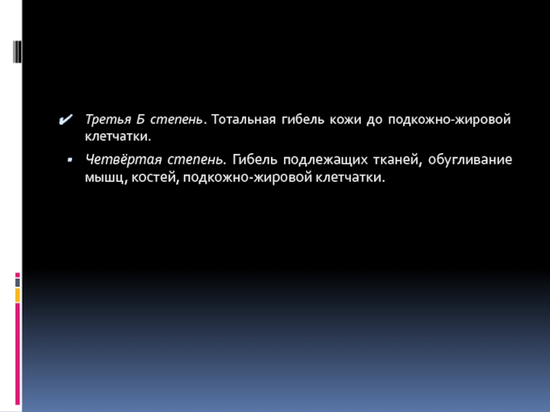 Слайд 5Третья Б степень. Тотальная гибель кожи до подкожно-жировой клетчатки.