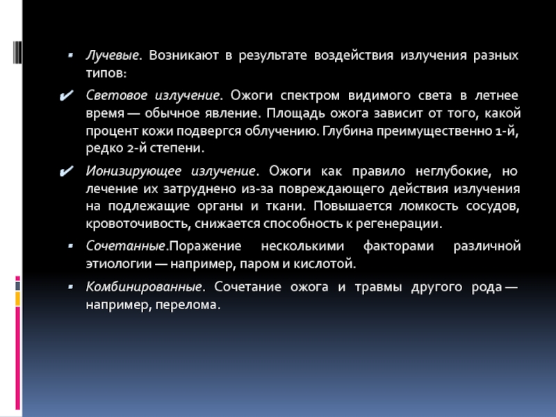 Ионизирующее излучение. Ожоги как правило неглубокие, но лечение их затруднено из-за повреждающего действия излучения на подлежащие органы и ткани. Повышается ломкость сосудов, кровоточивость, снижается способность к регенерации.