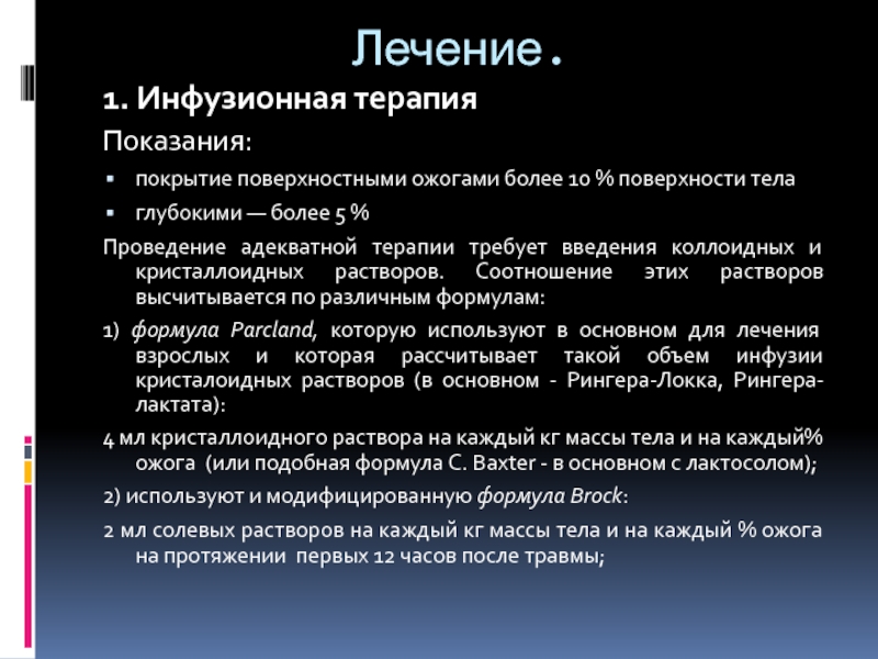 1) формула Parcland, которую используют в основном для лечения взрослых и которая рассчитывает такой объем инфузии кристалоидных растворов (в основном - Рингера-Локка, Рингера-лактата):