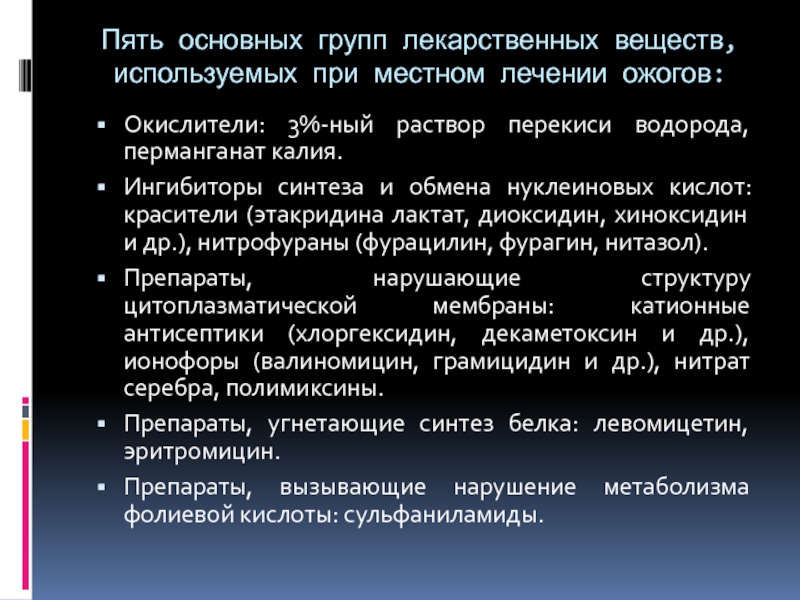 Слайд 26Пять основных групп лекарственных веществ, используемых при местном лечении ожогов: