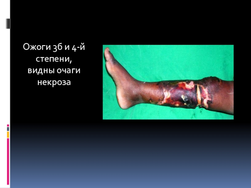 Слайд 9Ожоги 3б и 4-й степени, видны очаги некроза