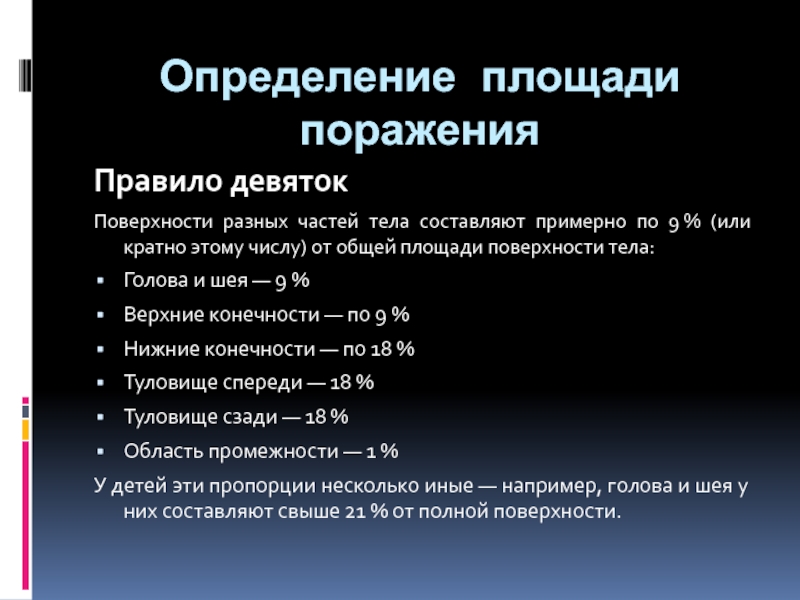 У детей эти пропорции несколько иные — например, голова и шея у них составляют свыше 21 % от полной поверхности.