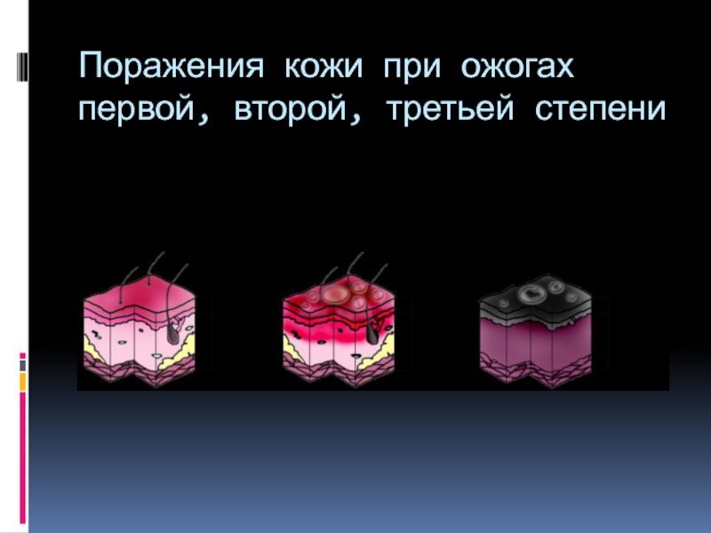 Слайд 6Поражения кожи при ожогах первой, второй, третьей степени