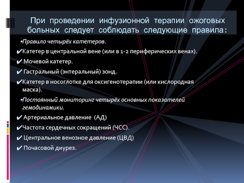 При проведении инфузионной терапии ожоговых больных следует соблюдать следующие правила:
