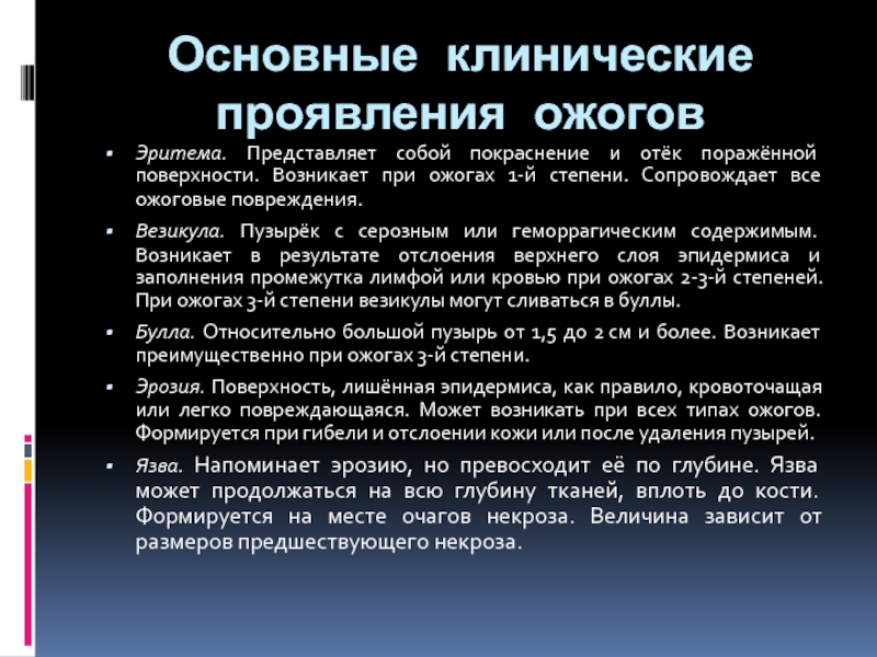 Слайд 15Основные клинические проявления ожогов