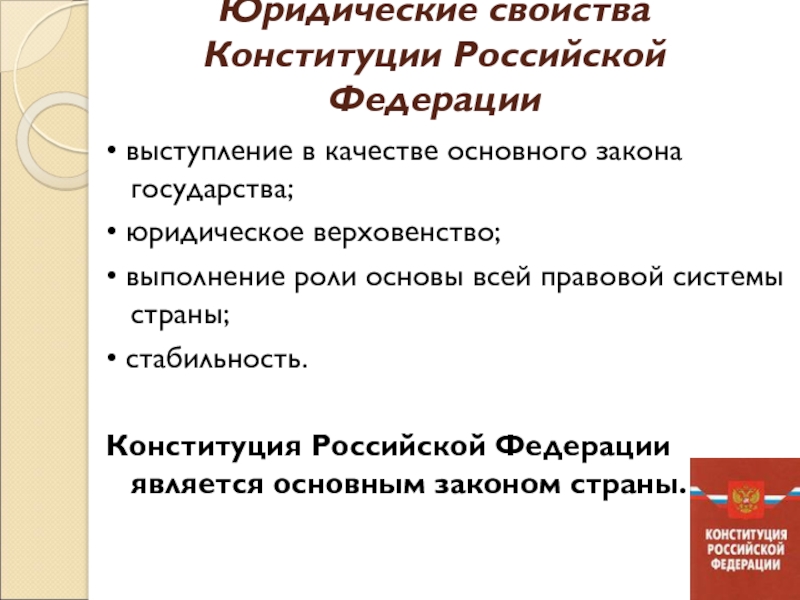 Слайд 5Юридические свойства Конституции Российской Федерации