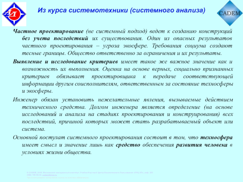 Основной постулат системного проектирования состоит в том, что техносфера имеет смысл и значение лишь как средство обеспечения развития человека в условиях жизни общества.