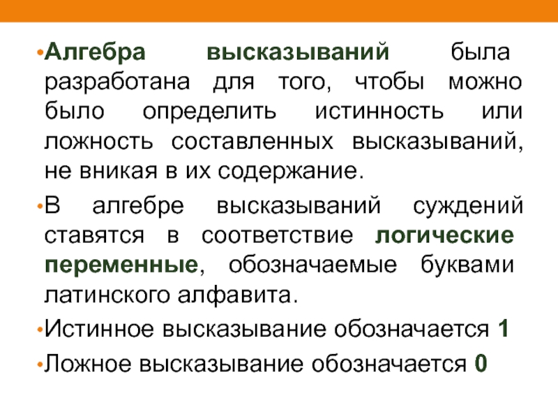 Слайд 10Алгебра высказываний была разработана для того, чтобы можно было определить