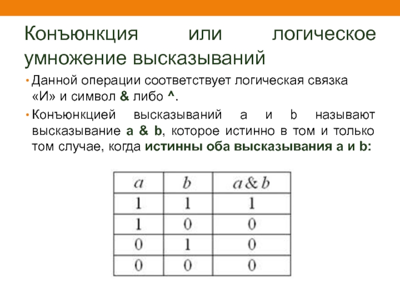 Слайд 15Конъюнкция или логическое умножение высказываний