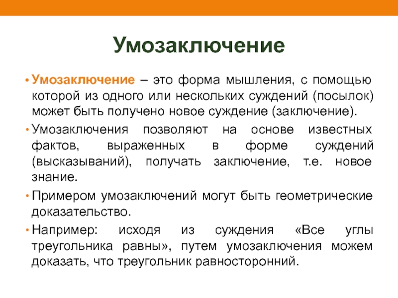Например: исходя из суждения «Все углы треугольника равны», путем умозаключения можем доказать, что треугольник равносторонний.