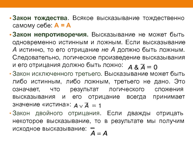 Закон двойного отрицания. Если дважды отрицать некоторое высказывание, то в результате мы получим исходное высказывание: