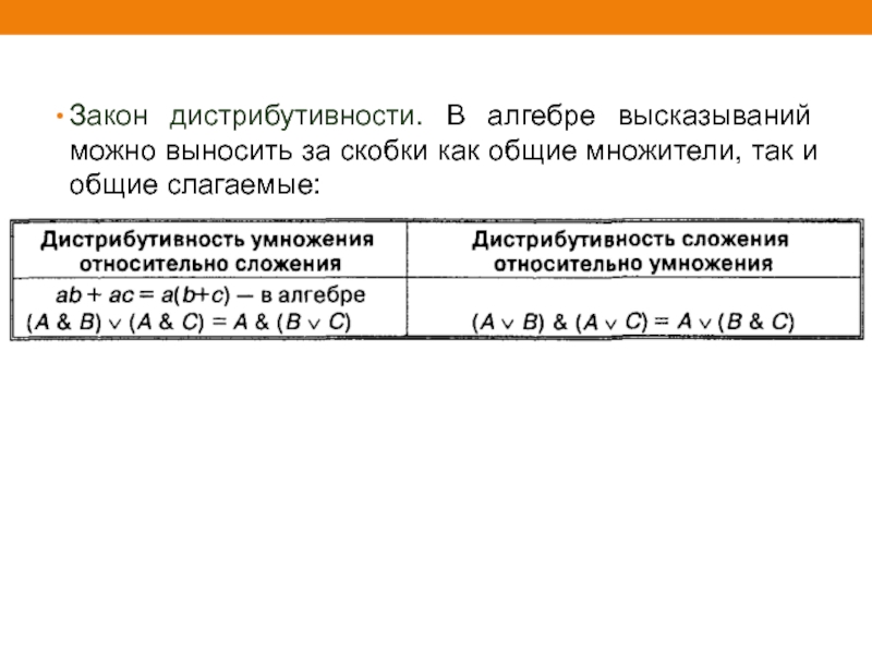 Слайд 28Закон дистрибутивности. В алгебре высказываний можно выносить за скобки как