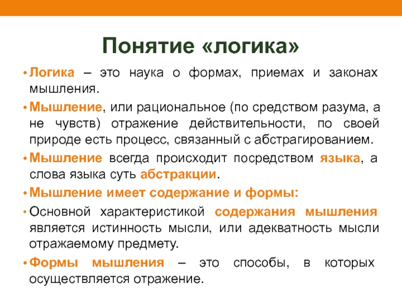 Основной характеристикой содержания мышления является истинность мысли, или адекватность мысли отражаемому предмету.