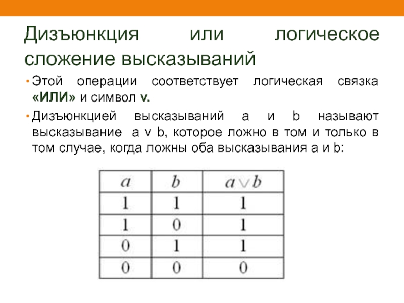 Слайд 16Дизъюнкция или логическое сложение высказываний