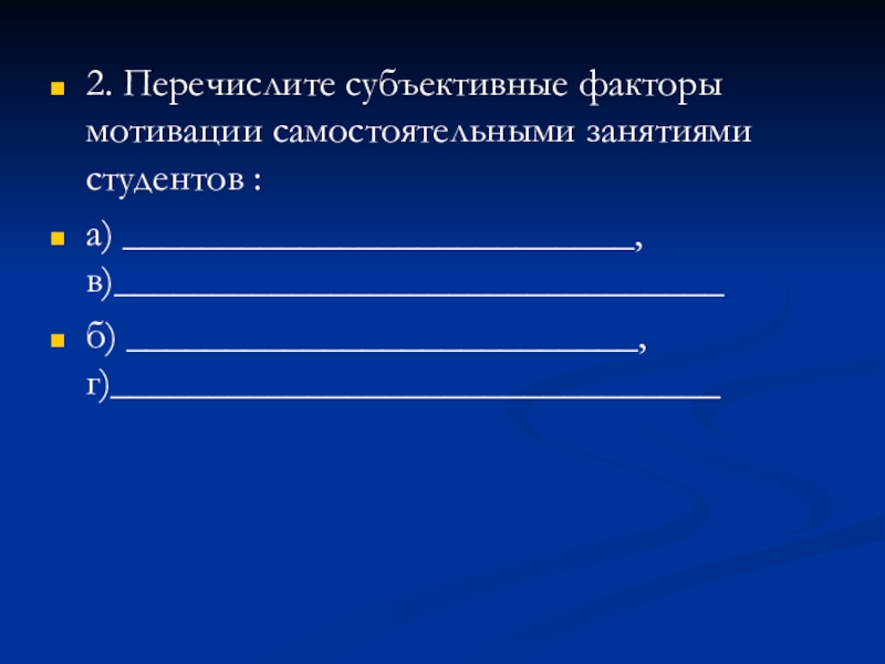 Слайд 652. Перечислите субъективные факторы мотивации самостоятельными занятиями студентов :