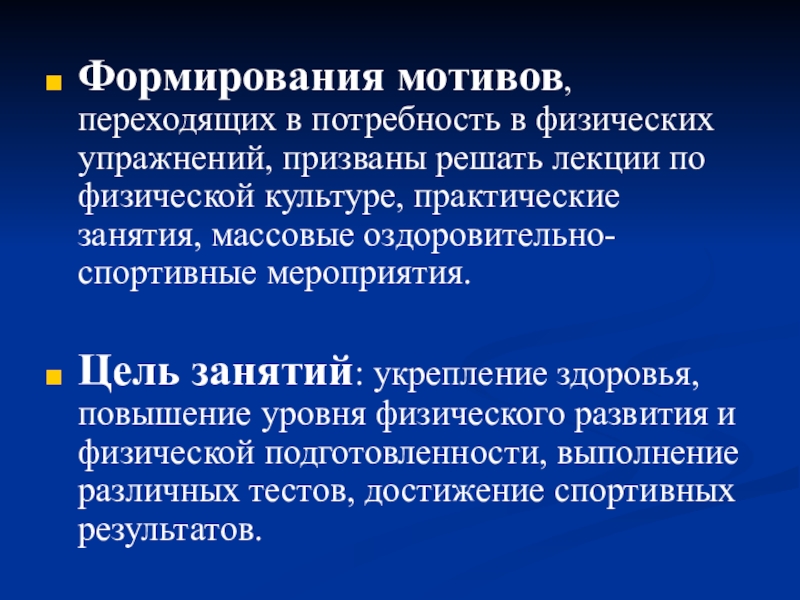 Слайд 6Формирования мотивов, переходящих в потребность в физических упражнений, призваны решать