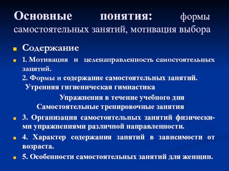 Слайд 2Основные понятия: формы самостоятельных занятий, мотивация выбора
