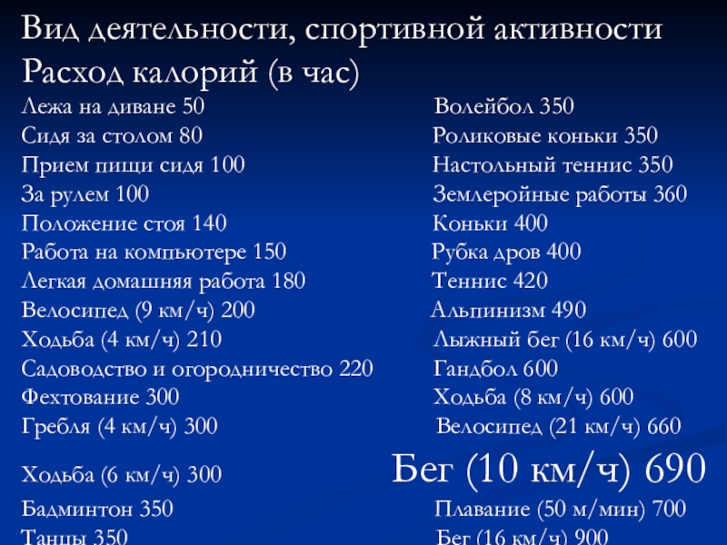 Ходьба (6 км/ч) 300 Бег (10 км/ч) 690