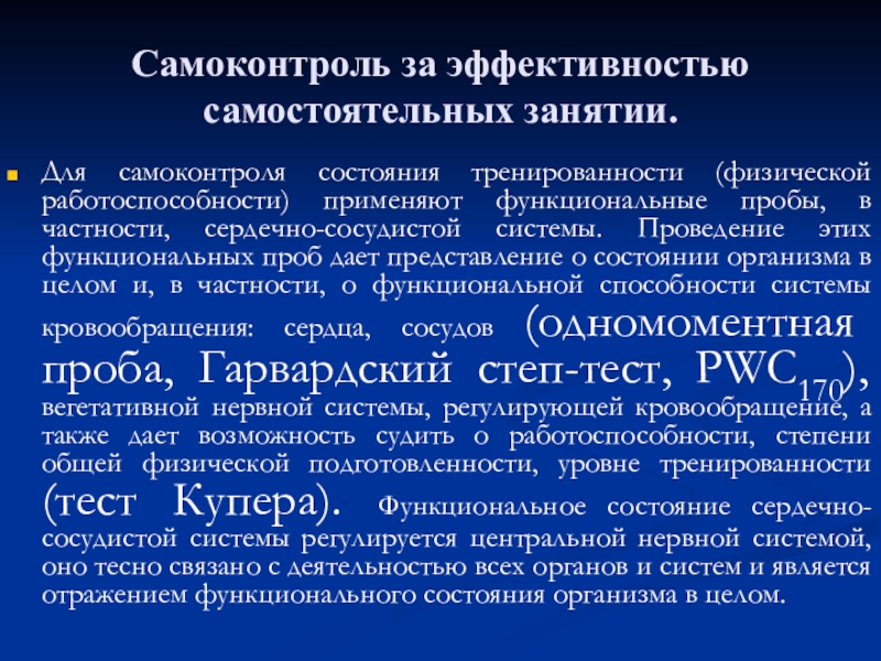 проб дает представление о состоянии организма в целом и, в частности, о функциональной способности системы кровообращения: сердца, сосудов (одномоментная проба, Гарвардский степ-тест, PWC170), вегетативной нервной системы, регулирующей кровообращение, а также дает возможность судить о работоспособности, степени общей физической подготовленности, уровне тренированности (тест Купера). Функциональное состояние сердечно-сосудистой системы регулируется центральной нервной системой, оно тесно связано с деятельностью всех органов и систем и является отражением функционального состояния организма в целом.