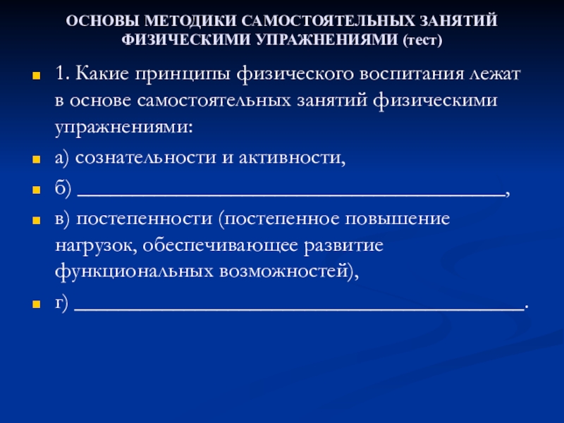 Слайд 64ОСНОВЫ МЕТОДИКИ САМОСТОЯТЕЛЬНЫХ ЗАНЯТИЙ ФИЗИЧЕСКИМИ УПРАЖНЕНИЯМИ (тест)
